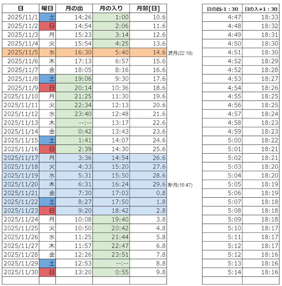 2025年11月の月の出カレンダーと星空・天の川観測の候補日