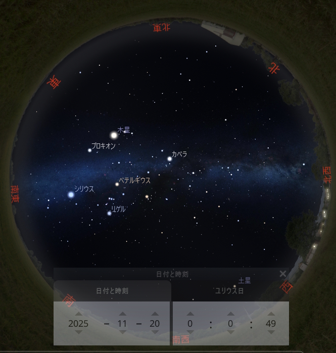 0時頃。南東から北西にかけて淡い天の川が流れます。オリオン座等の冬の星々も高く昇っています。
