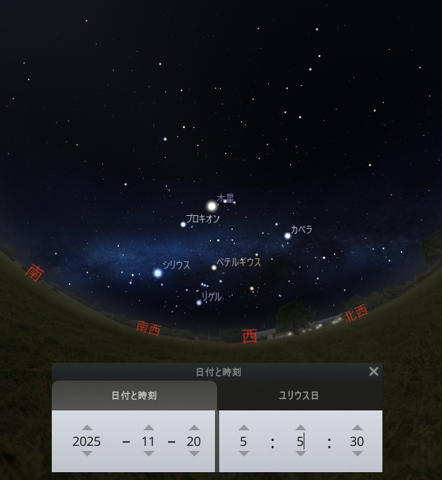 空が明るくなる5時5分ごろ。冬の星々、天の川は西の空へと大きく傾いています。